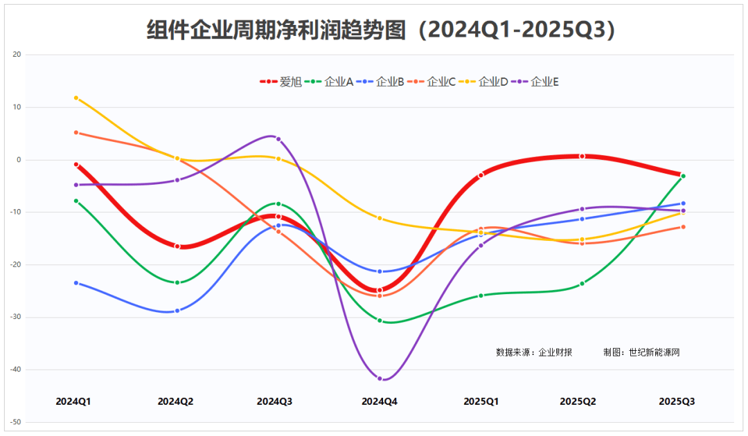 世纪新能源网对6家上市组件头部企业的2024Q1-2025Q3净利润数据举行网罗料理,能够看出爱旭自2024年Q4起,开端“触底”反弹,2025年Q2,更是以6286.49万的净利润“回正”,成为2024Q4从此,头部组件企业中唯逐一家净利润为正数的企业。